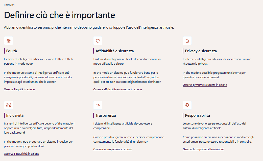 Era un cambio di prospettiva: non più “cosa può fare l’AI”, ma “quali conseguenze può avere sulle persone”. Da lì nacque un framework che oggi guida ogni team dell’azienda: i sei principi della Responsible AI.